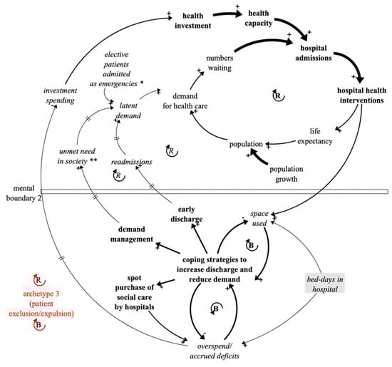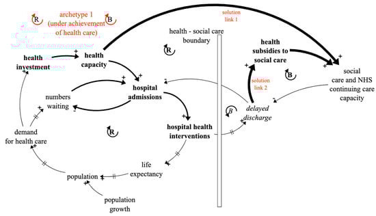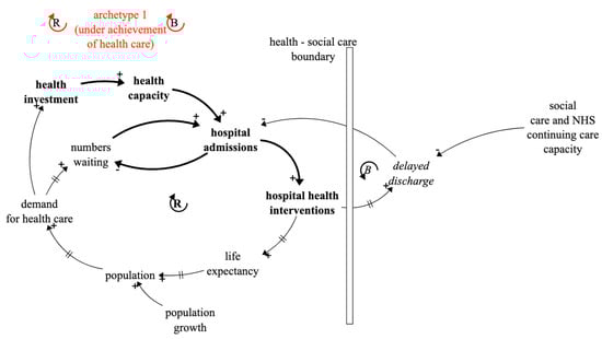 This archetype is a classic example of underachievement and captures the way in which the demand for health services is driven by both population growth and aging, but also by health services being a victim of their own success by increasing longevity []. The supply response is investment in all types of hospital capacity with the intention of facilitating admissions and interventions. However, even if this is forthcoming, it results in problems with delayed discharges resulting from inadequate social care capacity, which feedback to reduce admissions and to cause underachievement in the number of hospital interventions.