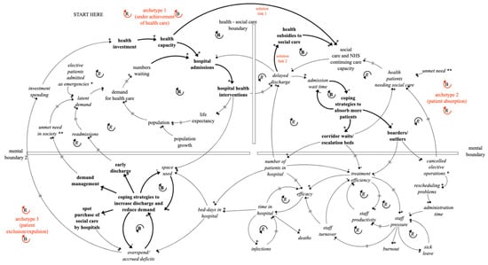 Determining and communication of complex feedback structure to facilitate system change is one of the axioms of system dynamics and this paper uses a new and novel approach which represents the cumulation of work over many years by the author to trace and demonstrate feedback connections between Health and Social Care [,,,,,,,]. One of the cornerstones of this work has been the judicial blend of qualitative and quantitative system dynamics, with qualitative hypotheses leading to testing with quantitative models and to further qualitative hypotheses. Numerous early models were quantitative and embedded the benefits to health of eliminating elements of coping strategies and individual generic archetypes were often used to explain unintended consequences. Discussions of the early quantitative work with health care staff have led over time to the surfacing of a much wider range of coping strategies with multiple unintended consequences. System dynamics has proven to be a valuable tool in teasing out the way in which organisations really work in response to the stress of capacity constraints. These coping strategies are all embodied in the next stage of qualitative analysis described in this paper. The resultant hypothesis is an amalgam of knowledge captured from health and social care professionals and from the modeler. A modeler who is also a domain expert, may be able to trace interconnections that those inside the field can sometimes miss and to link them to new initiatives such as ICSs.