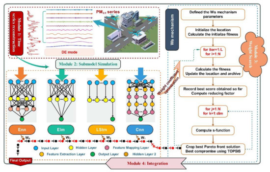 The individual ANN model is lack flexibility for the adjustment of parameters, which limits the improvement of prediction accuracy [30]. The optimization algorithm provides a new solution for improving the prediction performance [31,32]. J. Murillo-Escobar et al. [33] designed the Svr-Pso model to estimate the concentration of APs in five regions. Compared with the feedforward artificial neural network (FAnn) model used in the San Buenaventura University in Bello (BEL-USBV) (), Pso optimized the prediction performance of the hybrid model (). Q. Wu et al. [34] constructed the Ba-LSsvm model to predict the decomposed low-frequency data, while the high-frequency data were simulated after secondary decomposition. Ba-LSsvm model not only produced better prediction results than Pso optimization, for example, the value of mean absolute percentage error (MAPE) is reduced by but also included the function of external variables. Similarly, G. Li et al. [35] proposed the CEemdan-Dse-BVmd-Csa-KElm model to disintegrate the data with high complexity to simplify the input sequence. Csa mechanism searched the optimal adjustable parameters of the KElm model, which was conducive to configuring the model on demand and realizing effective prediction in multiple fields. However, the optimization mechanism only focuses on the improvement of the precision of model prediction, and the importance of model robustness is ignored. To balance various performances, a series of multi-objective optimization mechanisms [36,37] represented by the multi-objective dragonfly algorithm (Moda) [38], multi-objective chameleon swarm algorithm (MOcsa) [39], and multi-objective salp swarm algorithm (MSsa) [40] have achieved good results in energy prediction. It can be considered to develop a multi-objective optimization mechanism to weigh the prediction performance of APs. In addition, some of the latest research models are evaluated in Table 1.