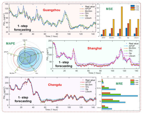 (b) For the dataset in Sh, the improvement of the APCP system for some models is even higher than that of the dataset in Gz. From the results of Experiment I, the fitting result of the dataset in Gz is significantly better than that of the dataset in Sh. It may be because the dataset in Sh is noisier. However, from the perspective of improvement effect, the APCP system can also exactly predict redundant data. Taking 2-step and 3-step predictions as examples, the values of MSE and MRE in the APCP system increase by at least and , respectively, while for the dataset in Gz, the minimum values of and are only and respectively.