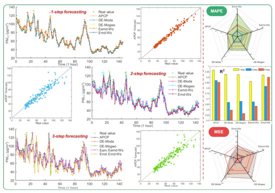 In the correlation analysis of all models, the APCP system has the strongest correlation with the real value . The predicted value of the APCP system not only does not decrease with the increase of prediction steps but also improves , which also confirms the stability of APCP system performance. For example, for the dataset in Cd, the value of the 1-step prediction is , while the value of the 3-step prediction is .