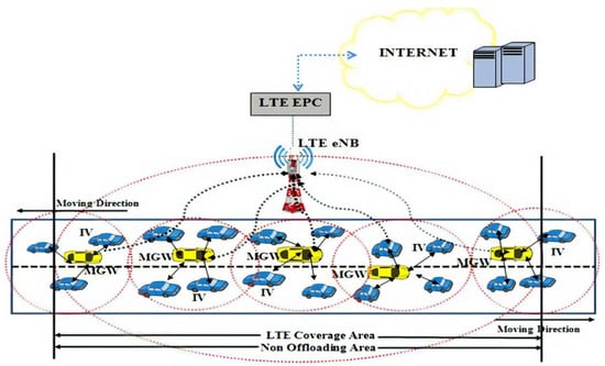 The vehicle density determines the load of an LTE network in a vehicular environment. Vehicle density is affected by not only the type of road, but also the time period [17]. For the model, in the peak hours, the vehicle density on the highway is expected to be high, and the probability of the LTE network being occupied by many soliciting associations will be very high. Permitting all vehicles to convey to the LTE network during peak hours will elevate the issue of overloading. The best strategy is to characterize the vehicles serving as a mobile gateway (MGW) that can aggregate delay tolerance (DT) traffic on behalf of the other vehicles and transmit them to the infrastructure network [18,19]. However, during non-peak hours, fewer vehicles are expected to be available, which causes the LTE network to unwind because of the presence of a low-level traffic load. For this situation, to notice the QoS of the VANET applications and increment the use of LTE network organization, the best technique has been to permit all vehicles to connect directly to LTE evolved Node B (LTE-eNB).