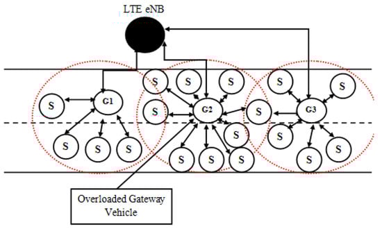 In the gateway selection process, the selected MGW can serve several vehicles more than its actual capability. This may result in an overloading problem on the selected MGW. If this condition occurs, the traffic transmitted to the LTE-eNB via the MGW will experience higher delay, and packets will be dropped due to the congestion. Figure 3 shows the overloading scenario of the MGW. The MGW G2 is connected to many vehicles, S, compared with the G1 and G3 gateways. This might happen if the MGW is the perfect gateway for many vehicles in its coverage area. If this happens, the G2 will be overloaded, and this can affect the overall network performance. To overcome this problem, the IV also needs to check the of each potential MGW candidate (i.e., NV) and include this as one of the metrics involved in the gateway selection process.