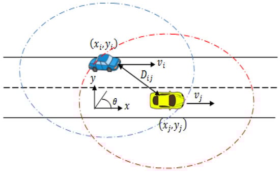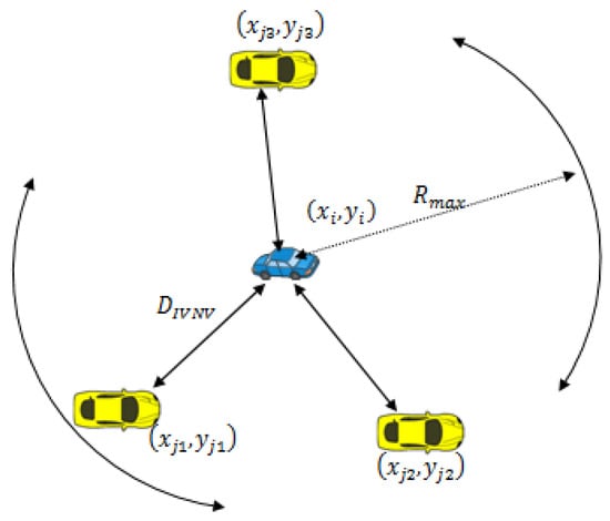 One of the challenges in designing the VANET is the frequent breaking of links due to rapid changes in vehicle position [44]. The link lifetime criterion reflects the stability of the link and the duration in which the link can be sustained without breaking. When the IV sends the GWreq, it inserts its position, location, speed, and moving direction. When the NV receives the GWreq message, it extracts all information needed to compute the . The current research’s LLT computation was inspired by [47]. Referring to Figure 5, the is calculated using Equation (8). The NV inserts the value into the GWrep message and sends back to the IV.