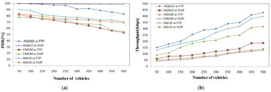 Evaluation of mixed application types (FTP vs. VoIP) vs. the number of vehicles: (a) the number of vehicles vs. the PDR; (b) the number of vehicles vs. the throughput.
