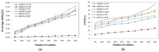 In addition, we examined how much more delayed the AQAGS scheme was on average compared with the CMGM and Adroit schemes. Figure 9a demonstrates how the AQAGS scheme provided the QoS requirement for VoIP and FTP applications for a wide range of vehicle numbers between 50 and 400. According to [48], the required delay for both VoIP and FTP applications is less than 0.1 s (i.e., 100 ms), and this range’s average reported delay falls under that threshold. Only the FTP application delay requirement, which must be under 0.3 s, is guaranteed for fleets of more than 400 vehicles (300 ms). Regardless, as the number of vehicles rose, the average delay did as well. When compared with the CMGM and Adroit schemes, the AQAGS scheme was able to maintain the QoS for both low-density and high-density traffic. Comparing AQAGS’s average delay with CMGM’s and Adroit’s, the difference was 78.53 and 40.12%, respectively. As a result, cluster formation, which involves the CH election process, is eliminated by the AQAGS. As opposed to the CMGM method, which necessitates the clustering of the vehicles and CH election before the gateway discovery process, our proposed method requires no such prerequisites. Additionally, the Adroit scheme does not take cluster formation into account and does not include application QoS in its solution. Regardless of the number of vehicles, the IV must always choose the MGW. The burden on the IV also rises as a result, which has an impact on the QoS of the applications. The maximum delays observed by CMGM and Adroit were 0.93 and 0.56 s, respectively, and are greater than the minimum delays required by VoIP and FTP, respectively.