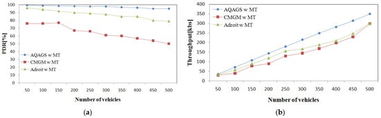 Figure 8a demonstrates that as the number of vehicles rose, the PDR for all three algorithms fell. However, the PDR of AQAGS at non-peak hours was 99.45%, which was higher than that of CMGM and Adroit algorithms by 23.45% and 3.45%, respectively. However, during peak hours, i.e., when there were 500 vehicles on the road, the AQGS scheme also performed better than its rival algorithms by 45.01 and 16.01%, respectively. In the execution of the gateway discovery and selection processes, neither of the other benchmarked algorithms took the density of vehicles into account. As a result, even though there were few vehicles, the CMGM and Adroit schemes chose to use the MGW as a relay to the infrastructure, which increased packet loss and had an impact on the PDR. The percentage of the PDR expressed by the CMGM and Adroit algorithms during non-peak hours (i.e., 50 vehicles), which were 76.12% and 96.23%, respectively, serve as evidence of this phenomenon. For the AQAGS scheme, the MGW selection only happens during times of high vehicle traffic (peak hours) and when delay-tolerant software is being used. As a result, the PDR increases because the vehicles have a direct, seamless connection to the LTE network, which lowers packet loss and increases the PDR. When there are more than 500 vehicles, AQAGS, CMGM, and Adroit report 95.01%, 50.22%, and 79.23% PDRs, respectively. The AQAGS scheme performed better than CMGM and Adroit overall by 33.01% and 9.6%, respectively.