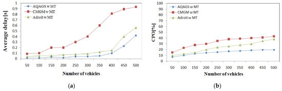 The proposed AQAGS scheme’s performance was assessed and benchmarked in this scenario with CMGM [22] and Adroit [28]. MT was used for each tested scheme. The number of vehicles varied from 50 to 500 and the speed of the vehicles was kept to 60 km/h.