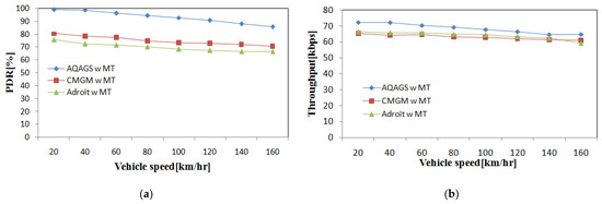 Figure 10b displays how changes in vehicle speed affect the VANET network’s overall throughput. For all three of the tested schemes, changing the vehicle speed had a serious effect on throughput. The throughput decreased with increasing vehicle speeds. However, for both low-speed and high-speed vehicles, the proposed AQAGS scheme outperformed CMGM and Adroit in terms of throughput. When compared with the CMGM and Adroit schemes, the throughput revealed by AQAGS was 7.52% and 6.83% higher, respectively. This is so that the best MGW can be chosen, which is influenced by the vehicle speed in AQAGS. This aids the IV in deciding which MGW it can trust to maintain a stable connection with for a while. Additionally, depending on the application, some IVs never require an MGW connection to connect to the LTE network; instead, they can directly send packets to the infrastructure. However, when the vehicle’s speed increased from 20 km/h to 160 km/h, the throughput of the proposed AQAGS scheme decreased by 1.46%. This decline was marginally greater than the throughput declines demonstrated by CMGM and Adroit, which were 0.83% and 1.36%, respectively. When examined further, we noticed that the CMGM scheme reported a lower throughput than the AQAGS scheme. The reason the CMGM method was able to maintain the throughput drop was that they arranged the vehicles in clusters, which improved the management of the links and helped ensure that the data packets arrived at their destination safely. Furthermore, Adroit performed worse than the competition in terms of throughput, which can be explained by the fact that Adroit never considers the connection time, which typically influences vehicle speed when selecting the best MGW.