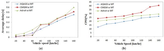 In this section, we evaluate how the vehicle speed affected the effectiveness of the mechanisms in the proposed AQAGS scheme and the equivalent mechanisms. The speed of the vehicles was changed from 20 to 160 km/h with an increasing interval of 20 km/h, and the number of vehicles was kept at 100. Mixed traffic (MT) of VoIP and FTP applications were used. Figure 10a illustrates how the PDR value is generally impacted by changes in vehicle speed. The PDR tended to decrease as the vehicle speed rose. All three of the schemes follow the same pattern. The AQAGS scheme, however, performed 18.33% and 18.73% better than CMGM and Adroit, respectively. The AQAGS method reported a 98.9% PDR for a lower vehicle speed of 20 km/h, which was 18.36% and 23.57% higher than CMGM and Adroit, respectively. The PDR for the AQAGS scheme dropped to 85.58% when the speed of the vehicles increased to 160 km/h, but it was still 15.13% and 19.24% higher than that of the CMGM and Adroit methods, respectively. The LLT between the IV and MGW was predicted by AQAGS, which accounts for this performance. The relative velocities of the vehicles are taken into account by the LLT, which provides an estimate of how long the vehicles can remain connected. The IV keeps track of LLT parameters as the vehicle’s speed rises and knows exactly where to start the search for a new MGW before the link breaks. In the cluster-based CMGM scheme, the speed of the cluster members affects how stable the clusters are. The clusters become unstable and require frequent re-formulation as the vehicle speeds rise, which can result in higher packet drops that have an impact on the PDR value. The PDR value reported by the CMGM scheme was still 5% higher than the Adroit scheme’s value. At lower and higher vehicle speeds, the PDR reported by Adroit was 75.54% and 66.35%, respectively. In Adroit, the best MGW is determined without consideration of the LLT. In other words, the IV can select the MGW with the shortest connection time, which causes frequent link breaks that impact the PDR.