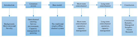 The follow-up research in this paper is organized as follows: In Section 2, we review the literature on omnichannel catering, the service environment, and the capacity management of queues. In Section 3, we construct a stylized base model to study the impact of the service environment on the merchant’s capacity management in the traditional catering industry. In Section 4, we study the impact of the service environment provided by omnichannel catering merchants on the online and offline shopping behavior of customers in the short term, and we analyze the optimal capacity formulation at different stages. In Section 5, we extend the omnichannel approach from short-term to long-term operations, and analyze online customers’ shopping behaviors to capture their characteristics during long-term operations. In Section 6, we perform a numerical analysis through theoretical models of offline single-channel, short-term omnichannel, and long-term omnichannel approaches. In Section 7, we present our conclusions. A flow diagram of the work is shown in Figure 1.