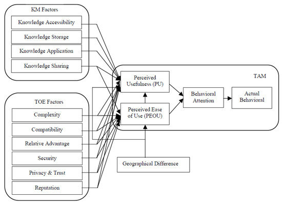 According to the literature, a growing number of researchers have looked at the success factors and effects of using cloud computing services. None of these studies, however, looked at the differences in knowledge management techniques and cloud computing, or SaaS, between cultures. More recently, researchers are now investigating moderating effects to enhance the power of TAM [56]. As a result, the focus of this study is on the moderating role of culture in the relationship between knowledge management methodologies and TAM for cloud-based service adoption. In light of these considerations, the key hypothesis driving the presented empirical research is that, if a software-based change occurs in a company’s innovation operations, the company is more likely to support dispersed development and innovation techniques. Additionally, the investigation of the impact of knowledge management methods on the adoption of cloud computing services, notably SaaS, across cultures is also reported. TAM paired with TOE is used in this study as a crucial predictor of technology adoption behavior by merging perceived usefulness (PU) and perceived ease of use (PEOU). The interaction between knowledge management techniques and cloud computing services is investigated in this research, with a focus on regional (cross-cultural) differences. Figure 1 depicts the suggested research model, and Table 1 lists the proposed expanded TAM, TOE, and KM components, as well as the research hypotheses.