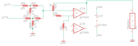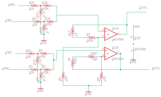 Finally, the resulting voltages from the potentiometers are sent to another adder circuit, as shown in Figure 6. This is the last adder circuit in the schematic. The result of this adder is the output of the board, which can be supplied to another GDES node, if needed, for further processing. Note that this diagram includes a second OP AMP, which is shown without connections as the ICs have two packaged into a single chip and only one of the two is used in this instance.