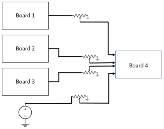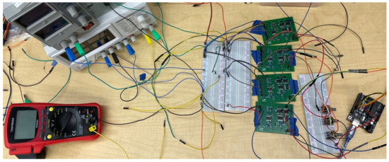 As previously noted, the power supplies’ voltage regulation was used to provide the inputs’ weighting for the initial boards, under the first configuration, for experimental purposes. For the second configuration, the power supplies’ voltage regulation provided the weighting for all inputs for board 1 and the second through fourth inputs for boards 2, 3, and 4.