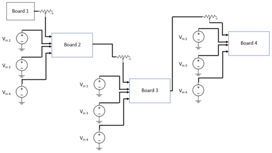 In the second configuration, shown in Figure 10, board 1 is connected to four independent inputs (not shown in the figure), as was the case in configuration 1. Boards 2, 3, and 4, receive their first input from the output of the previous board and the other inputs are connected to independent voltage sources.