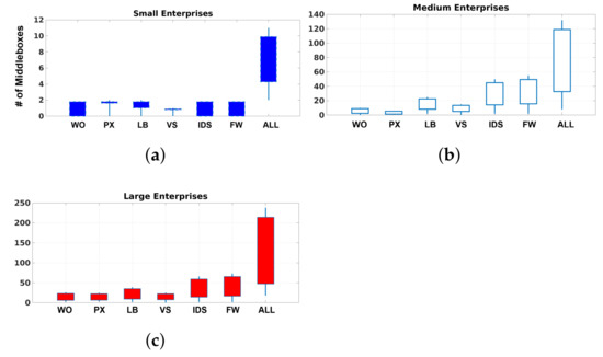 Number of middleboxes that are deployed in enterprise networks of various sizes. (a) Middleboxes in small enterprises. (b) Middleboxes in medium enterprises. (c) Middleboxes in large enterprises.