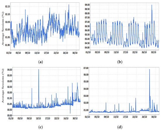 The collected statistics showed that multiple duplicate middleboxes of the same type, (i.e., IP firewall, IDS/IPS, or load balancer) were installed inside the same network. For example, when we closely looked at one of the investigated service-provider networks, we found that every interface that was associated with an untrusted network was connected to a firewall and an IDS. In some cases, duplicate middleboxes are installed in parallel for high availability. Thus, the utilization of the firewalls and IDSs relies on the activities of the customers in the connected branches. To demonstrate our claim, we collected the utilization statistics of four middleboxes (two firewalls and two load balancers) installed in various locations inside a service-provider network, as shown in Figure 3. In fact, we noticed that every common service chain is grouped in an independent set, so firewalls must exist in every set. This means that the maximum utilization of every set could not exceed the firewall utilization. Additionally, the datasets provided have multiple firewalls and load balancers; their utilization was similar to that displayed in the figure. The statistics were collected during October.