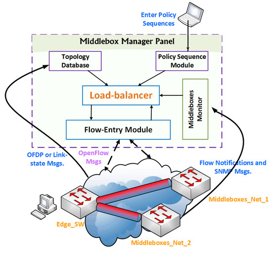 One of the key considerations in the design of our solution is to make it topology-independent. The network traffic routing decisions and operator specific policies must be set by a central entity, and the middleboxes must be plugged out from a traffic link. The middlebox manager is the one responsible for the edge switches’ configuration. As explained in the previous section, this special configuration enables edge switches to route in-scope traffic to the subnet of the middleboxes. Furthermore, the middlebox manager is responsible for balancing the traffic load between the available subnets of the middleboxes, and configures their switch with the right flow entries to maintain the policy sequence. Figure 4 shows the main modules that form the middlebox manager panel, including the network topology database, load balancer, and policy sequence module. The figure also shows how these modules interact with each other and how they interact with the other data-plane devices. In the following paragraphs, we will describe some of these modules in detail.
