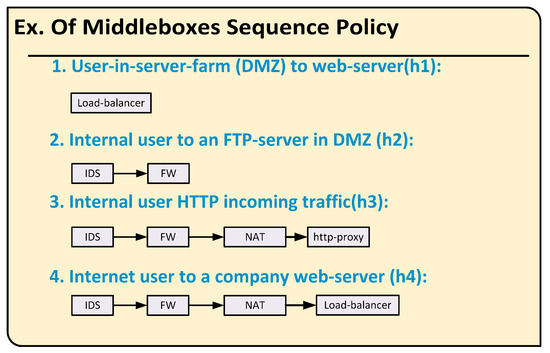 Policy Sequence Module: The network administrator is responsible for configuring the middlebox manager with the network policy classes, similar to the ones shown in Figure 5. This figure shows several examples of policy sequences. These sequences could easily be classified into multiple classes where each class contains the list of middleboxes that must be visited, and the order of these visits is by the flows that match this class.