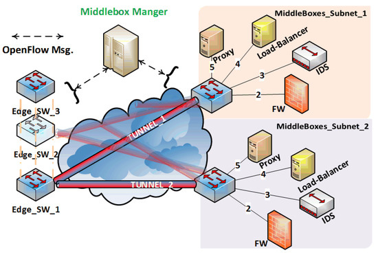 The motivations of load balancing are not bonded by spreading the traffic load among available resources. In addition, the value of middleboxes’ resources and denial of service concerns include unacceptable delays that could reach milliseconds for multimedia services. In this work, we used an optimal flow assignment method to spread the load among the available subnets of the middleboxes. When the middlebox manager receives a flow-setup request of in-scope flow, it selects the middleboxes’ subnet based on the optimization model that is explained in Section 3, and builds an end-to-end tunnel between the edge switch and the selected middleboxes’ subnet.