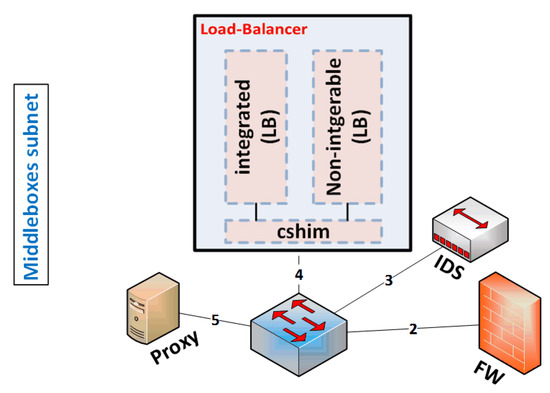 To address this shortcoming of utilization, the scattered middleboxes could be efficiently gathered in multiple centralized subnets. Middleboxes from the same type would be integrated together, forming one super middlebox. In turn, the super middlebox should be able to handle the traffic from other subnets, in addition to the traffic of its own subnet. Accordingly, we need a mechanism to forward the traffic from remote subnets to the right middlebox before it reaches its final destination. Researchers in pLayer [7] proposed the Layer-2 mechanism to route traffic through a sequence of middleboxes connected to a policy-based switch. Unfortunately, this solution did not address the issues of load balancing, utilization, and cost. Similarly, the authors of CoMb [4] proposed a method for middlebox function-level consolidation into a shared hardware box. In the same context, several other solutions have proposed moving middleboxes from the enterprise network to the cloud [8,9,10]. These efforts suffer from the high latency of routing the internal traffic to the cloud. In addition, they likely face serious hindrances in terms of resilience and security concerns, due to several challenges. Some examples are the hard-to-modify dedicated hardware middleboxes, the growing rigorous security practices and their concerns, and the serious resistance to deploying radical solutions. As an alternative, we propose a more practical solution that can make use of the available resources.