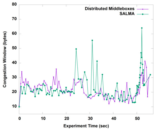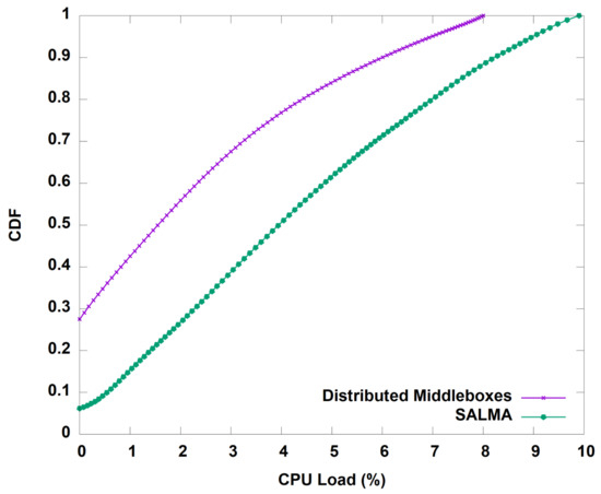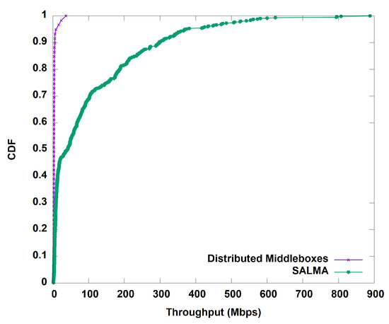 Network setup time: In reactive mode, we needed to install proactive flow entries to build a tunnel between every switch and the two middleboxes’ subnets. The reactive flow entries were also used to dynamically balance the traffic load among the two subnets of middleboxes. Furthermore, we proactively used the installed flow entries to maintain the policy sequence of the flows that exit from the proxy. Since SALMA needs only a few flow entries, the setup time was in the range of 30 ms, as shown in Table 3.