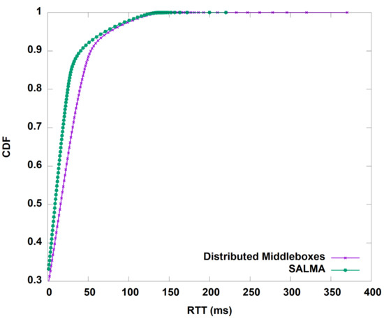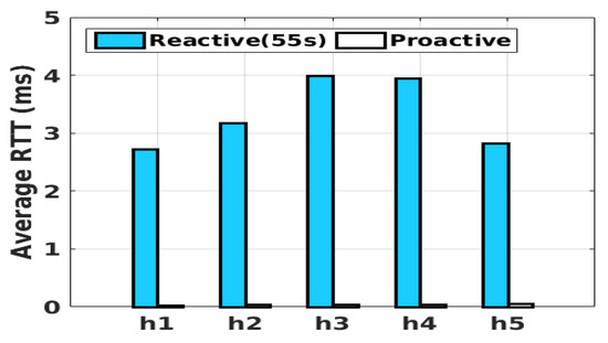 Flow setup delay: In order to dynamically assign the new flows to one of the middleboxes’ subnets, the middlebox manager is involved in the flow setup process. We built a simple topology in Mininet to test the flow-setup process’s delay and compare it with the proactive mode. The network was composed of only a single switch, a controller, five hosts (h1–h5), and one server (h6). We tested the effect of the flow-setup process on round-trip time; where the flow entry expiration time was 55 s. The flow-setup delay was zero in the proactive mode, since the flow entries were already installed, and there was no need to communicate with the controller to set up a flow. The comparison is shown in Figure 14. The average flow-setup delay for the reactive scenario was 3.3 ms.