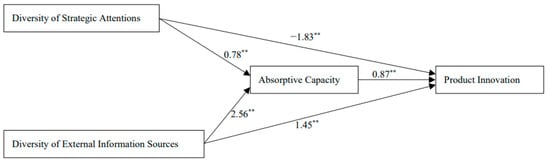 By paying attention particularly to the roles of absorptive capacity that synthesize the inward learning experiences and the outward learning efforts, we now examine how absorptive capacity mediates the effects of attention allocation and external information sources on the performance of product innovation. We first begin by proposing that absorptive capacity mediates the relationship between the diversity of attention allocation and product innovation. As mentioned earlier, absorptive capacity is a core component of adaptive subsystems of a firm that has been established by incorporating a long managerial effort over a broad range of organizational activities [,]. In particular, the literature highlights that the top management’s pursuit of diverse organizational goals tends to be embodied in its absorptive capacity when the goals are innovation focused [,,]. As a main function of absorptive capacity is to interpret and comprehend the firm’s organizational goals regarding innovation-related activities, it is where the diverse organizational goals are collected and cognitively processed into purposeful actions [,]. As Todorova and Durisin [] suggest, a firm’s strategic intentions towards innovation activities are reformulated by its absorptive capacity in terms of the strategic values it pursues. By focusing on the inward learning aspect of the absorptive capacity, therefore we argue that the absorptive capacity shows its mediating functions in linking the top management’s attention allocations to the product innovation outcomes, so proposing our hypothesis as follows: