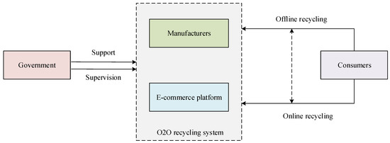 The online to offline (O2O) recycling system is an organic combination of manufacturers and e-commerce platforms that is characterized by the smooth connection between the manufacturers’ offline business and the e-commerce platform’s online business. In this sense, the system is very complex, being multi-participant and multi-element. Meanwhile, the government also plays an important role as a participant in the system. In a real closed-loop supply chain, because it contains a large number of manufacturers and e-commerce platforms, this cannot guarantee that individuals in any group can pursue the optimal strategy completely rationally. In this context, we establish a tripartite game evolution model of government, manufacturers and e-commerce platforms to explore the behavioral strategy selection and system evolution path. Among them, manufacturers and e-commerce platforms respectively carry out the waste product recycling business. With the development of information technology, the asymmetric information and the fragmented logistics restrict the waste product recycling in the consumer market. Building an O2O recycling system composed of manufacturers and e-commerce platforms can ensure the smooth circulation of waste product information and logistics, explore more potential environmental protection consumers and recover more waste products to increase enterprise profits. For example, Apple and Huawei both have their own electronics recycling business. Meanwhile, in 2014, Apple partnered with eBay to recycle and sell manufactured iPhones. On 6 September 2022, JD and Huawei jointly launched a sustainable plan to promote the development of circular economy by encouraging users to consume rationally, recycle old goods and trade in old goods for new ones.