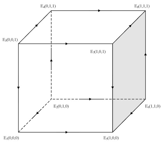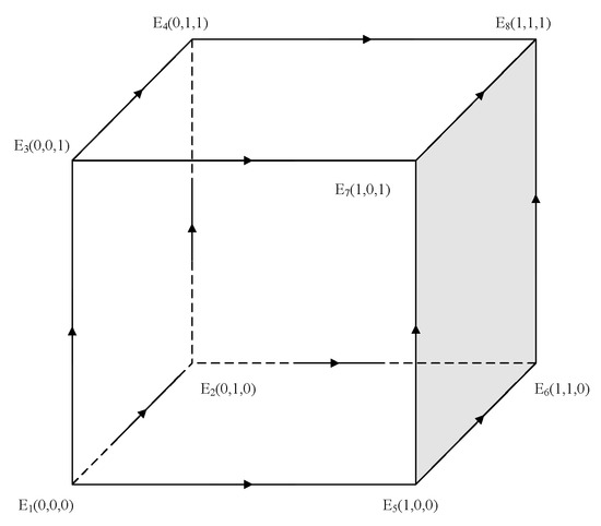 It can be seen that the eigenvalues of Jacobian matrix are , and at this time. By analogy, the eigenvalues of the Jacobian matrix corresponding to the eight equilibrium points can be obtained by substituting them into the Jacobian matrix, as shown in Table 4.