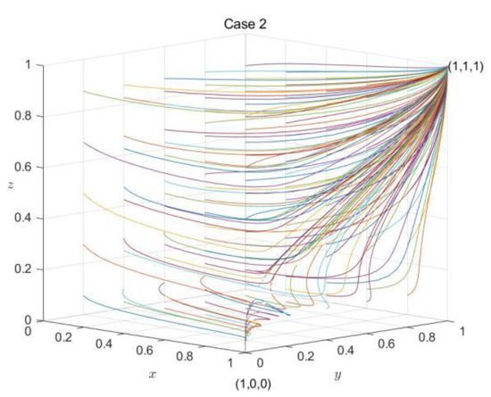 We make the value of the parameters of the income matrix equal and input the dynamic system into Matlab. The strategy of the three players starts from 0.1 to 1, simulates with a spacing of 0.2 and finally draws 125 lines; the output result is shown in the corresponding lines in Figure 6, Figure 7 and Figure 8.