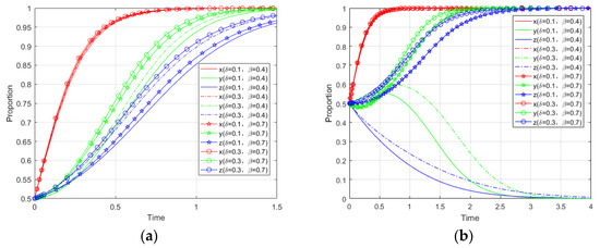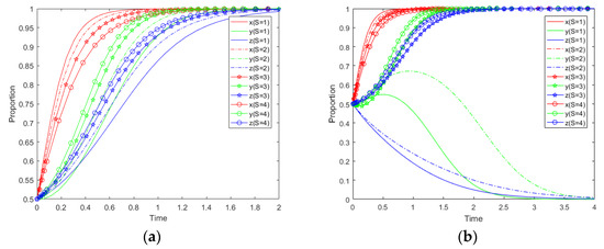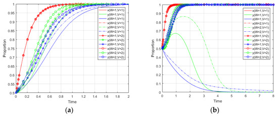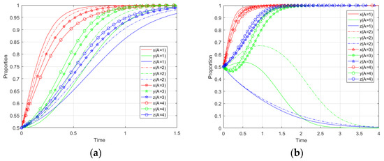 Similarly, we analyzed the influence of government subsidies and advertising on the game players’ behavior evolution in Case 2, and the simulation results are shown in Figure 9b and Figure 10b. We still use the solid line as a benchmark for comparison. Increasing government subsidies and advertising to enterprises can enable enterprises to reach the no-cooperation stable equilibrium point later than the initial state. Moreover, as government subsidies and advertising increase, enterprises’ behavior will evolve into being stable for cooperative strategies.
