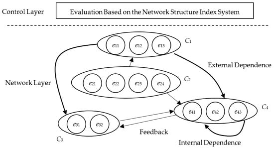 Step 1: Construct the typical structure of the ANP. A simple schematic diagram is shown in Figure 1. The first part is the control layer that represents the evaluation based on the network structure criteria system. The second part is the network layer, where each element group or element is not independent, one element may affect any element in the entire network system, and vice versa. In Figure 1, Ci represents the ith element group, eik represents the kth element of Ci, and the directed line represents the relationship between elements.