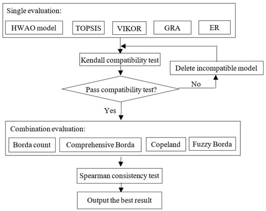 There is no strict distinction between the intuitionistic fuzzy MCDM methods in Table 3, and they can be theoretically used for 3PRLP evaluation. Since models based on criteria preferences require more subjective parameter values, we do not consider such methods. Among the models based on AOs, the hybrid weighted averaging operator (HWAO) considers the importance and position of each criterion simultaneously and has some good properties, such as idempotency and boundedness [], so we apply HWAO for 3PRLP evaluation. Among the three models based on the distance from the reference points, namely TOPSIS, EADS, and MABAC, we choose TOPSIS because of its clear meaning, simple calculation, because it has the most extensive application. Among the models based on the utility from the reference points, namely MULTIMOORA, CPT, MARCOS, and VIKOR, we choose VIKOR because it considers group utility and individual regret simultaneously. In this way, we use five single MCDM methods to evaluate 3PRLPs at the same time, namely HWAO, ER, TOPSIS, GRA, and VIKOR. Because the results of single evaluation methods may not be the same, we need to test their compatibility using Kendall’s concordance coefficient method and obtain the compatible models []. Since the purpose of 3PRLP evaluation is to determine the reasonable and consistent ranking of multiple 3PRLPs, we apply the ranking-based combination evaluation models, and include Borda count, comprehensive Borda, Copeland, and fuzzy Borda models [], to combine the results of compatible models. Finally, we output the best combination evaluation results that pass the Spearman consistency test []. The evaluation process is shown in Figure 2, which includes the single evaluation, Kendall compatibility test, combination evaluation, and Spearman consistency test.