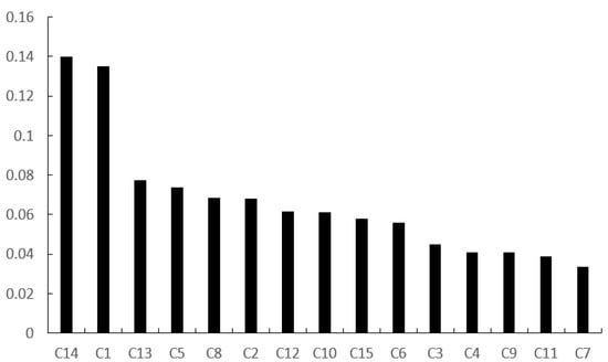 Step 2: Construct a weightless hypermatrix. Taking the element ejl in a certain element group Cj as criterion, in terms of the degree that ejl affects each element eik (k = 1, 2, …, ni) in the element group Ci, we can construct a judgment matrix. After the consistency test, we output the eigenvector that satisfies the consistency. Summarizing the eigenvectors of each judgment matrix into a matrix Wij, which reflects the influence relationship between the elements in the element group Ci and those in Cj, and we can obtain the weightless hypermatrix as follows: