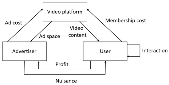 On the video platform, the utility of the users is mainly affected by four factors. Firstly, when watching videos, the users can obtain basic utility by satisfying their curiosity or entertainment needs; secondly, during interactions (such as: “like”, “comment”, and “share”), the users increase their perceived utility by increasing the content and entertainment and by showing their personalities; thirdly, the users become bored when they see lots of ads on video platforms, which reduces their utility; finally, if the users need to pay to use the platform, this also reduces their utility. In addition, the advertisers’ utility consists of three dimensions. On the one hand, advertisers can profit from users; on the other, advertisers must pay sponsorship fees to place ads on a video platform. In addition, advertisers incur fixed costs associated with the operation. Some scholars solve platform-related problems using utility models [1,20]. Based on their contribution, we suggest that the utility relationship between the users and the advertisers is as follows: