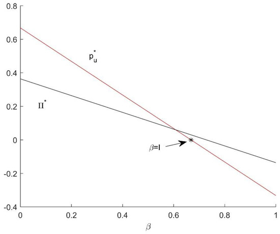 In the case of , the difference is that interactivity positively affects platform pricing. When exceeds the threshold, the platform absorbs all of the potential users in the market. For this to happen, the user price cannot be excessive. As interactivity increases, so does user utility. This makes users tolerant of the price. Another difference between the two cases is where , . If the video platform has all of the users in the market and is sufficiently high, the advertisers can obtain optimal profits on the video platform. The problem of the optimal income in the previous case does not exist. Thus, the platform needs to reduce the user price to make up for the user’s utility loss caused by advertising nuisance, thereby retaining the number of users and increasing profit. The proof of Corollary 3 is in Appendix A.