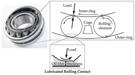 Figure 1. Cylindrical roller bearing and lubricated rolling contact with the formation of a hydrodynamic oil film (right).