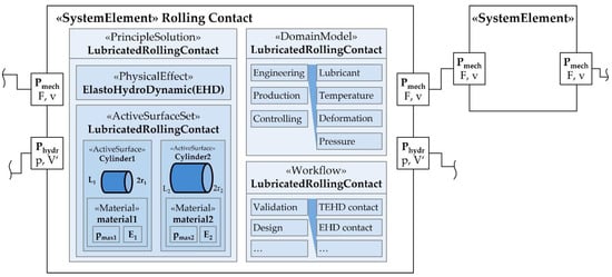 The domain model section in the system element contains and structures all models relevant for the development of the scope (e.g., Lubricated rolling contact). At the top level, a differentiation is made between engineering, production and controlling models, whereby only the engineering domain is considered in this publication which typically applicates models of analytical and numerical nature calculating the physical behavior of system elements. Here, the models are classified according to their computational purpose, such as the deformation of the active surfaces or the temperature in the lubricated rolling contact [3,4,14].
