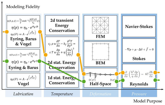 An extract of known domain models for the system element ‘lubricated rolling contact’ is shown in Figure 4. As already mentioned, they can be distinguished by purpose and fidelity [14] whereby the term fidelity is used here in the combined sense of validity and detail of [44]. In our example three domain models of various fidelity can be differentiated for the purpose ‘temperature calculation’ ranging from the assumption of a constant temperature to a fully spatially resolved, transient temperature evolution. Depending on the required modeling fidelity of (thermo-)elastohydrodynamic lubrication calculations in the lubricated rolling contact, different modeling strategies can be applied as demonstrated in Figure 4. For instance, in order to model the lubrication film, either temperature (represented by Barus equation) or pressure dependencies of the viscosity (represented by Vogel equation) in the lubrication film or the combination (represented by Eyring, Barus, and Vogel) can be considered to reach the desired fidelity levels in simulations. Analogously, different approaches for temperature, deformation and pressure calculations can be used [31,32,49]. Please note that the domain models shown are only a small excerpt. Both in the published research literature and in companies, such as a bearing manufacturer, a significantly higher number of models will be found. Based on the extent shown here, an elastohydrodynamic (EHD) calculation (Figure 4, green line) and a thermo-elastohydrodynamic (TEHD) calculation (Figure 4, yellow line) can be found as meaningful model configurations and performed as calculation.