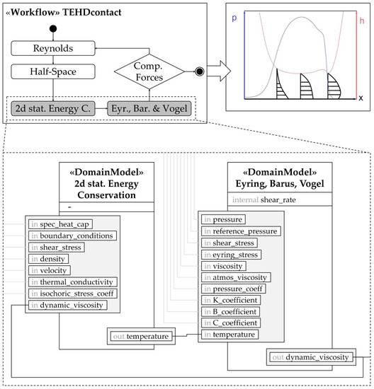 Figure 5 shows the parameters which are exchanged between the domain models if a TEHD calculation is executed. The depicted workflow (Figure 5, top left corner) combines the Reynolds equation, half-space theory, energy equation and fluid models for viscosity. After iteratively solving the equations for required parameters with given boundary conditions, the film thickness and pressure distribution in the contact area will be achieved as the result of the simulation model (Figure 5, top right corner).