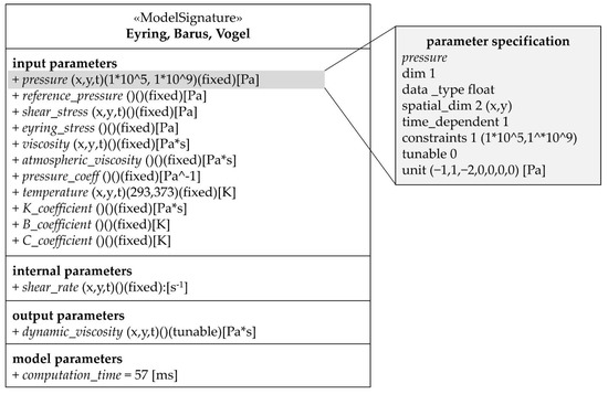 The domain model signature specifies all input, output and internal parameters, concerning their name, dimension, data type, physical quantity and unit, spatial and temporal resolution as well as admissible regimes (Figure 6). Additionally, it is indicated whether the parameter is fixed or tunable inside the model. For example, it is defined that the domain model ‘Eyring, Barus, Vogel’ needs an input parameter ‘pressure’ with unit ‘Pa’, which is resolved in x and y direction as well as in time. This parameter is fixed since it is not changed or optimized inside this particular domain model. This fluid model is valid for moderate temperatures [50] and low pressures [49]. To fix the admissible regimes in the proposed model signature, temperatures up to 100 °C and pressures of 100 kPa to about 1 GPa are assumed as an example. The parameter specification (Figure 6, right) is a suggested notation that allows an algorithm-based evaluation of parameter compatibilities. For example, the unit Pascal is expressed via the exponents of the power product of the seven standardized SI units [51].