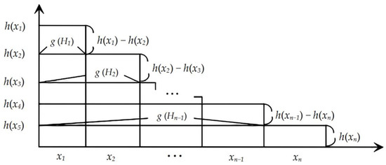Let be a measurable set function defined on the fuzzy measurable space, and supposing that , then the Fuzzy Integral of fuzzy measure with respect to can be defined as Equation (3) [34,35] and shown in Figure 1: