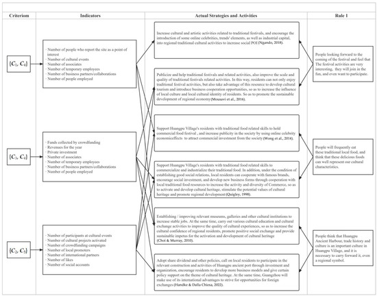 The rules calculated by RST show that in order to make the local cultural identity of Huangpu Village’s residents tend to be the highest, the attention should be paid to both Rule 1; Rule 2. Additionally, Rule 3; Rule 4; Rule 5 shall be tried to avoid according to this situation, the study will discuss the revitalization and development scheme of cultural heritage in combination with three revitalization and development criteria {C1, C4}, {C3, C4}, and {C2, C5} that are mentioned above.