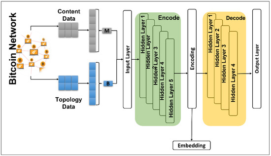 Nonetheless, the above-stated approaches tolerate several drawbacks. They cannot reveal potential imperceptible links between nodes in the network. Furthermore, they cannot automatically weigh different features with adequate balanced parameters. To overcome these challenges, we proposed a method to measure the structure of the Bitcoin networks and get a deeper view of the network division, also called communities. The proposed method combines topology and content data using a Deep Learning (DL) algorithm. DL quickly examines deep non-linear connections and combines Deep Feedforward Autoencoders [21] and spectral clustering [22]. We designed each element of the proposed DL model for a particular purpose. (1) To create the Modularity Matrix (B), we used the Modularity Model (Q) to cluster topology data. (2) To generate the Markov matrix (M), we utilized the normalized-cut model (NCM) to cluster content data. (3) We applied spectral clustering (SC) to find the low rank embedding to reconstruct the spectral matrix. (4) To reproduce the input matrix, we used the Deep Feature Representations (DFR) algorithm to combine the modularity and Markov matrices. (5) We adopted Deep Feedforward Autoencoders (AFE) to combine different parameters of each node to create a profound depiction of the nodes.