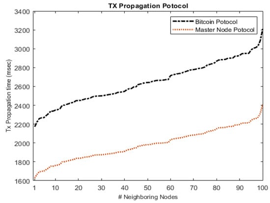Data propagation time () in simulated Bitcoin network using both default protocol and Master node-based protocol.