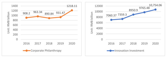 Social responsibility and innovation are focal themes in the field of social management system research. With the social trends toward open innovation and collaborative innovation, organizations are increasingly connected with external stakeholders, and their innovation cannot be separated from close collaboration and resource integration with governments, customers, etc. As the highest form of corporate social responsibility [1], philanthropy refers to the donation of a certain amount of money, in-kind resources or services by enterprises to those in need, mainly for social support, poverty alleviation, earthquake relief, etc. It plays an important role in helping enterprises to gain the support of stakeholders and thus benefits them [2]. As shown in Figure 1, according to the China Charitable Giving Report (2021), the total amount of corporate donations in China in 2020 was RMB 121.811 billion, accounting for 83.52% of the total social donations, an increase of 30.77% year-on-year, achieving corporate donations of more than RMB 100 billion for the first time. At the same time, Chinese enterprises’ investment in R&D management systems continues to grow—an increase of up to 21.73%. Among them, more than 24% of enterprises have more than 10% R&D personnel, and more than 12% of them have more than 3% of R&D investment intensity. These data show that Chinese enterprises are still making high-intensity R&D investments while achieving high intensity participation in philanthropy.