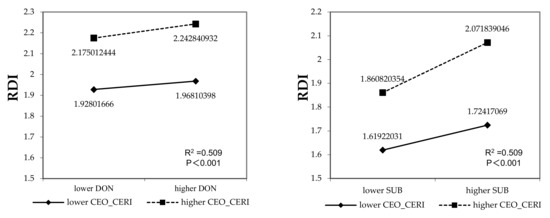The main explanatory variables were standardized before calculating the interaction terms, and the related regression results are presented in Table 5. The moderating effect of the direct influence of generalist CEOs on the relationship between charitable giving and innovation investment was first tested. The results of models (5) and (6) in the table show that the coefficient of Don*CEO_CERI is significantly positive (β = 0.292, p < 0.01), indicating that the level of diversity of the CEO has a significant positive moderating effect on the relationship between philanthropic donation and corporate innovation investment. A broad range of career experiences help CEOs to develop diverse management skills and superior boldness, so generalist CEOs with broad career experience are better able to identify “meaningful adventures” [32] and are more innovative. This relationship is illustrated in the left panel of Figure 3, where hypothesis H4 is verified. Secondly, the moderating role played by generalist CEOs in the indirect pathway relationship among philanthropic donations, government resource acquisition, and innovation investment was examined. The results of models (1) and (2) in the table show that the coefficients of CEO_CERI and Don*CEO_CERI are not significant (β = 0.101, p > 0.1; β = 0.130, p > 0.1). Therefore, hypothesis H4a was not supported. The results from models (3) and (4) in the table show that generalist CEOs enhance the positive relationship between government S&T resource acquisition and corporate innovation investment (β = 0.246, p < 0.01). Hypothesis H4b is supported, and the moderating effect is plotted in the right panel of Figure 3.
