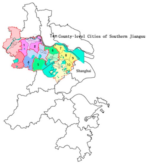 In China, county-level cities are the basic units promoting industrialization and urbanization, maintaining the overall plan of their towns and implementing the requirements of their corresponding prefecture-level cities. Liu et al. [], Qian et al. [], Wang et al. [] have emphasized the importance of county-level cities from the perspective of urbanization and land space planning, respectively. Southern Jiangsu, located in the Yangtze River Delta (shown in Figure 1), includes Nanjing, Suzhou, Wuxi, Changzhou and Zhenjiang. Southern Jiangsu became famous in China due to the “Sunan model” developed in the 1980s. The concept of the “Sunan model” was first put forward by Fei [], which refers to the way that farmers in southern Jiangsu rely on their own strength to develop township enterprises to achieve non-agricultural development. Many enterprises were begun at the township level as a result.