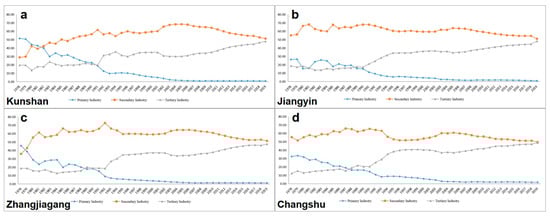 Since the 1980s, secondary industry, which is accepted as the industrial sector in China, has possessed the dominant, motivational position in southern Jiangsu. For example, the economies of Kunshan, Jiangyin, Zhangjiagang and Changshu, measured by their GDP, have been ranked as the top four county-level cities in China. The statistical records clearly show that the four county-level cities of southern Jiangsu have shown the characteristics mentioned above since the implementation of the reform and opening up policy in China (shown in Figure 2). Their economic structural changes have been driven by changes in the share between the primary industry (which mainly refers to the industries related to breeding, planting and cultivating biological materials, including agriculture, forestry, animal husbandry and fishery, etc.) and tertiary industry (which refers to other industries except the primary and secondary industries, mainly including wholesale and retail industry, transportation, warehousing and postal industry, accommodation and catering industry, information transmission, software and information technology service industry, financial industry, etc.), whereas the share of the secondary industry has always been high. This stable secondary industry share in the county-level cities has persisted since the end of the 1990s and appears to be locked.